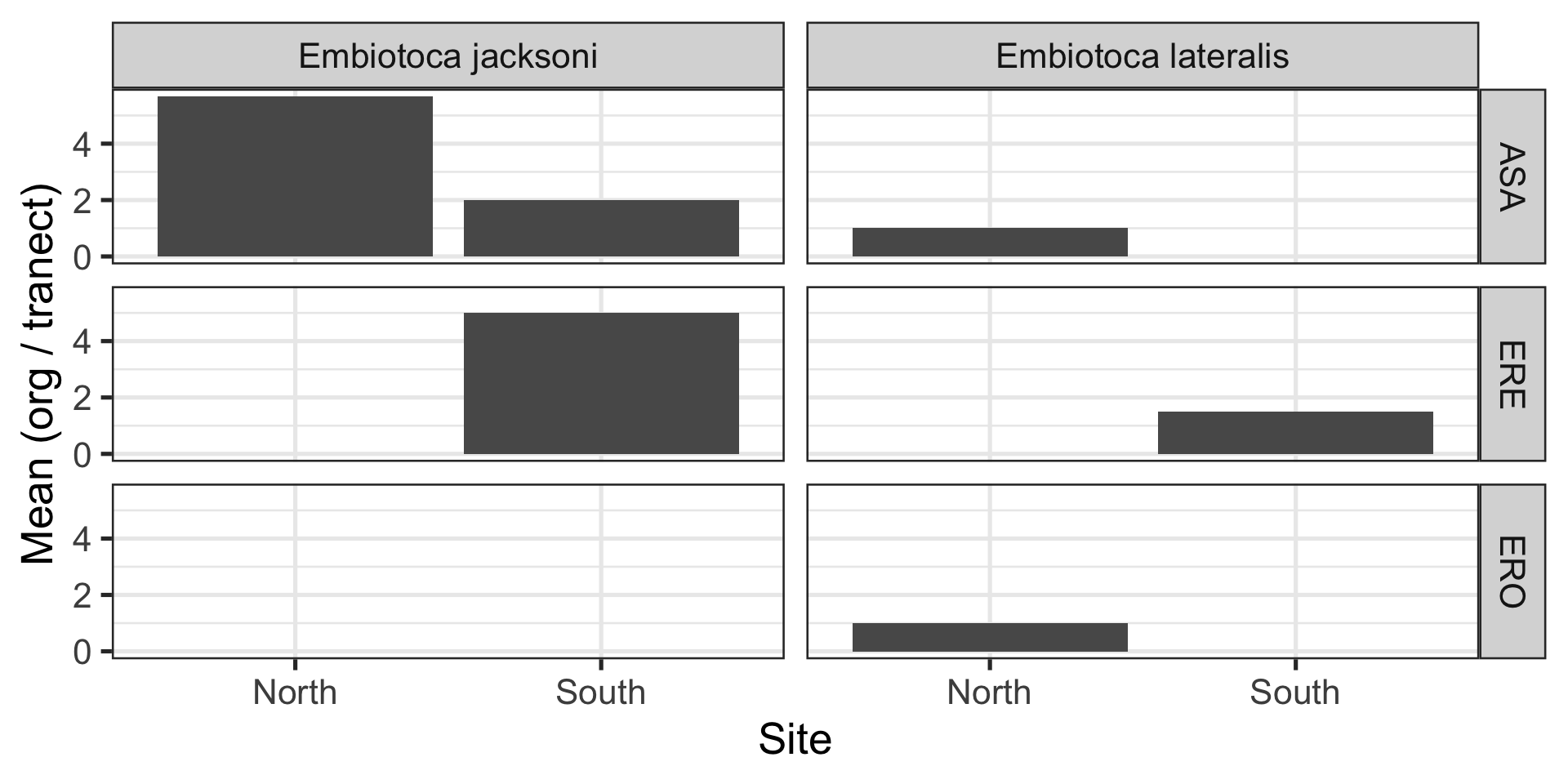 labs(x = "Site", y = "Mean (org / tranect)")