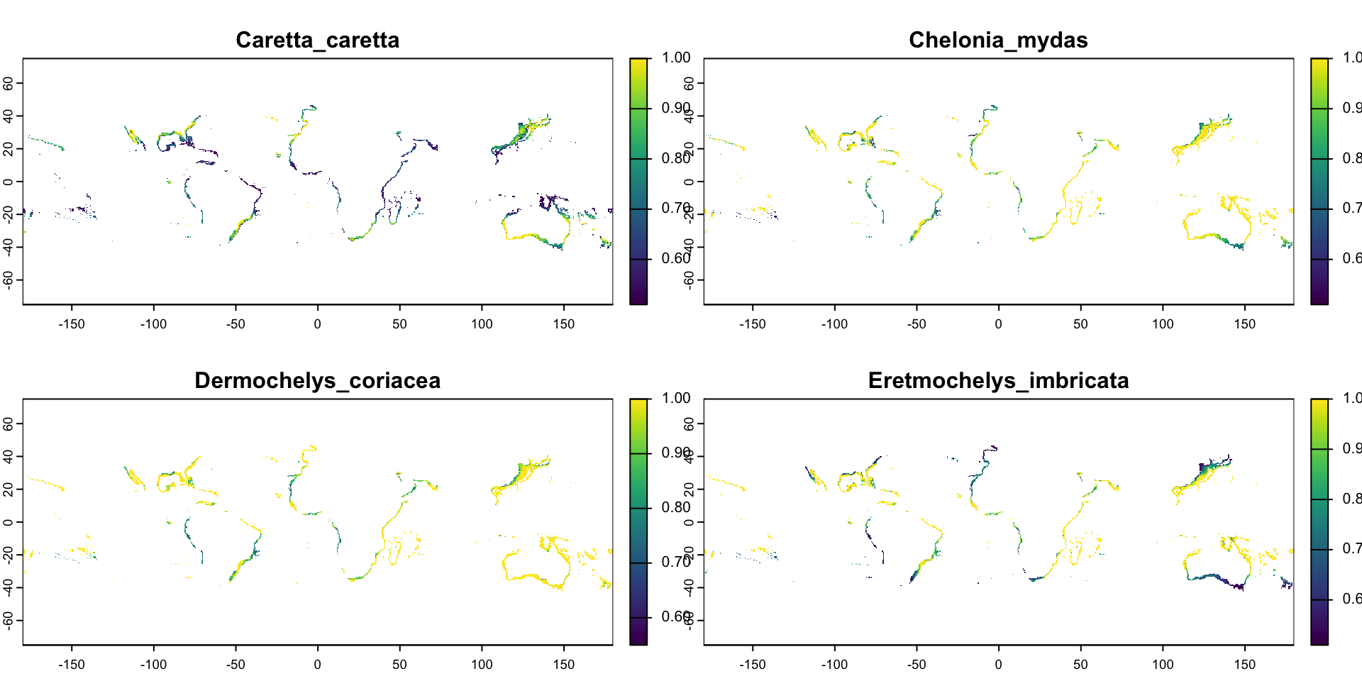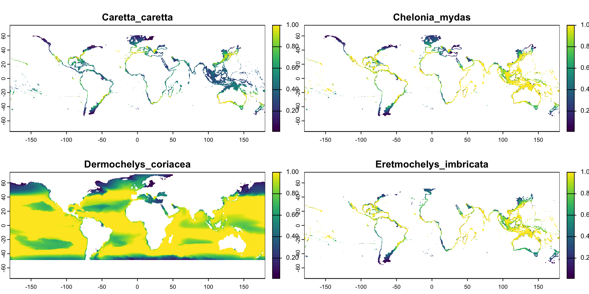 terra# Let's read habitat suitability models for four sea turtle species